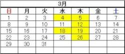3 月 営業日のお知らせ (黄色文字・休業日)